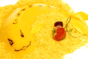 Corte a cereja ao meio e ponha-as no sítio dos olhos da lampreia. Com o glacé desenhe a boca, os lábios (contornando o figo), os olhos (em volta das cerejas) o lombo, os contornos, etc. Coloque as amêndoas prateadas nos fios de ovos que envolvem a lampreia. | |  |