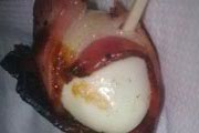 Enrole cada ovo numa fatia de bacon e prenda com um palito. Leve ao forno até tostar.
